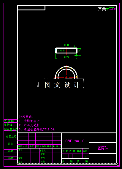 此零件类似盖形,属于圆筒形拉深件,工件的地面还有圆孔,在零件的中心,因此属于对称件,这类零件,常常设计成多工序的复合模,因此本次零件设计正装落料拉深冲孔复合模,绘制模具二维,三维图。