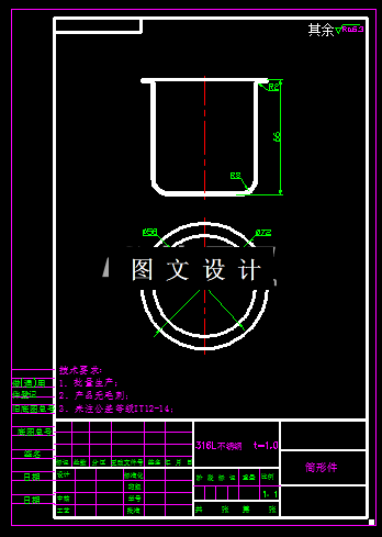 从图形分析,显然是个典型的凸缘拉深件,且凸缘尺寸比较小,拉深部分尺寸比较大,显然不止一次拉深,通过详细计算拉深系数后,绘制出首次拉深工序的图形,针对这个图形,设计首次落料和拉深的正装复合模。