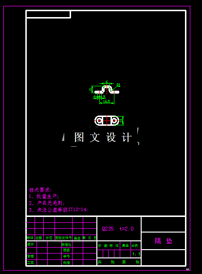此零件是隔垫,从图形分析,是个四角弯曲件,中间没有孔,外形由直线和圆弧过渡,因此通过计算展开尺寸,绘制展开图后,发现是个规则对称的零件,本次设计就是针对这样的形状,设计正装落料模。