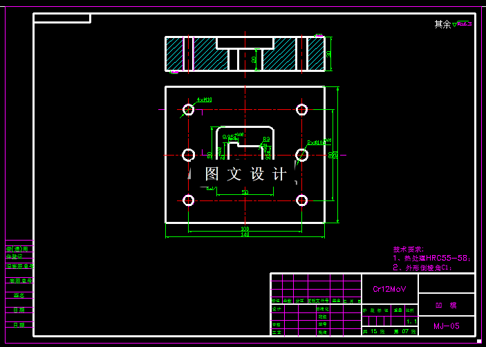 本次设计的轭铁零件,属于平板,采用冲裁类模具即可,此类模具分倒装,正装结构,还有多工位结构,结合工件形状尺寸,本次选择倒装复合模,通过计算模具外形尺寸,绘制模具结构图。