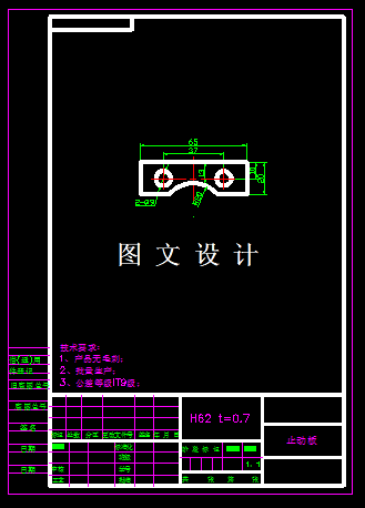 此工件只有落料和冲孔两个工序。材料为H62,属于软态黄铜,其抗剪强度为260MPa,抗拉强度为300MPa,具有良好的冲压性能,适合冲裁。工件结构相对简单,中间有2个 9mm圆孔,两侧对称分布,孔与孔、孔与边缘之间也满足要求,最小壁厚为5.0mm,远远超过零件的厚度。因此选择复合模结构。