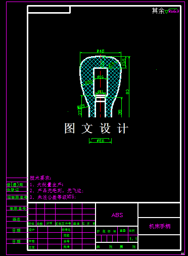 本次设计的是机床手柄的注塑模,该零件外面包的塑料,中间有个嵌件,用于安装,因此设计模具时要考虑嵌件如何定位,设计模具时浇口位置也要合理安排,不影响手感。