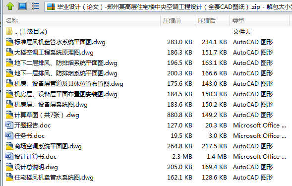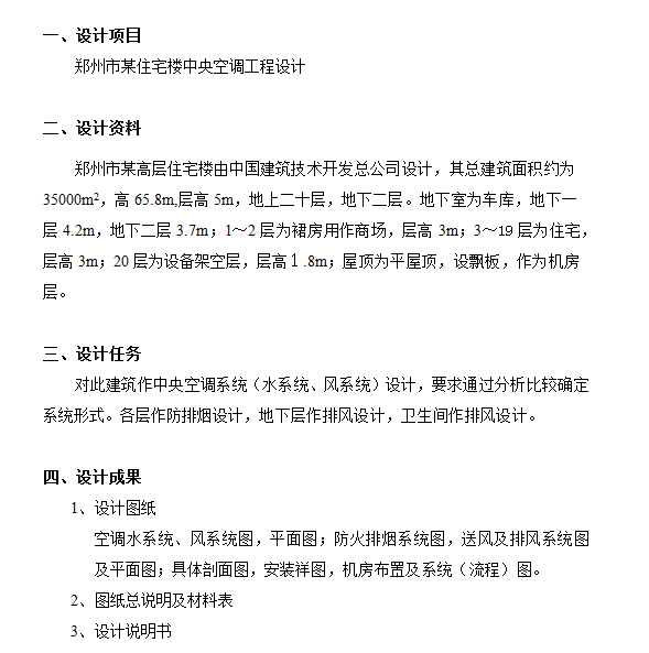 该论文为华北水利水电学院2000级环境工程系建筑环境与设备工程专业毕业设计论文。其主要任务是对郑州某高层住宅楼建筑作中央空调系统(水系统、风系统设计),各层作防排烟设计,地下层作排风及防排烟设计。