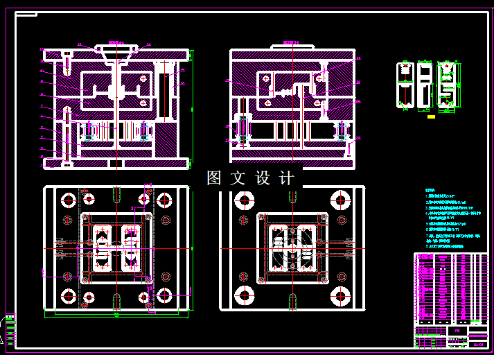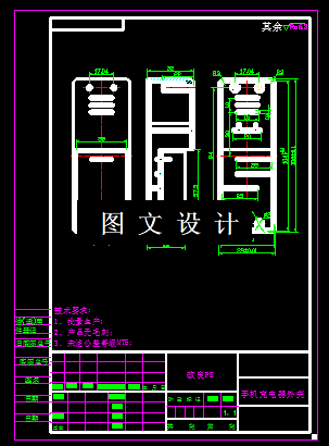 本次设计的是手机充电器外壳,从图形分析,该零件形状复杂,中间有台阶,还有加强筋,外形尺寸适中,因此通过分析后,选择一模两腔结构,设计模具结构图和非标零件图。