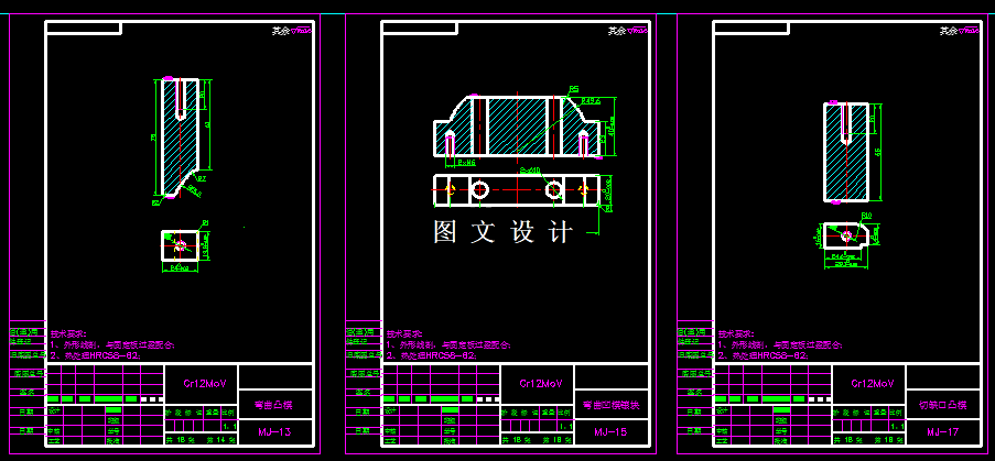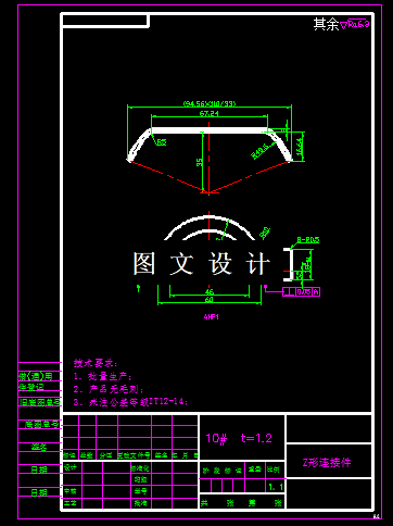 本次设计的汽车活塞普通翅片,是一个弯曲零件,只是弯曲的形状不规则,但却是对称件,所以设计模具时,采用级进模设计,弯曲底面部分作为排样时的连接载体,这样设计最合理,模具寿命长,具体见CAD模具结构。