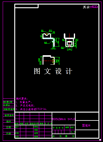 本次设计的零件叫固定片,工件形状复杂,需要通过多次弯曲才能实现,而且尺寸也小,如果采用单工序模具,不但工序多,工人操作也很不方便,因此设计级进模是最合理的,通过详细计算和分析后,设计出合理的模具结构方案,编制冲压工艺卡。