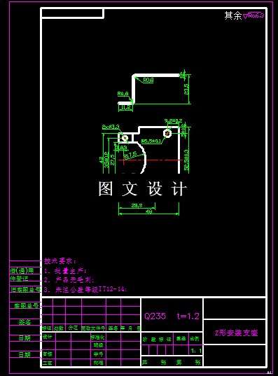 本次设计的支座,成Z形,外形不规则,而且是单侧弯曲,如果采用单工序冲压,至少要两套弯曲模,才能保证模具的稳定性,因此设计该零件建议采用一出二的设计方案,对称设计最后切断,这样能保证模具的稳定性,工件的合格率。