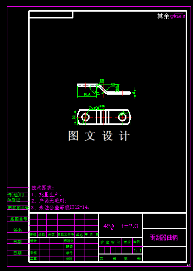 本次设计的雨刮器曲柄,零件形状简单,是个Z形弯曲件,零件上有两个孔,所以其基本工序有落料,冲孔,弯曲,通过对工件尺寸和形状分析,设计冲压级进模能满足生产需求,因此本设计就是针对该零件进行CAD模具设计,并记录计算数据和过程。