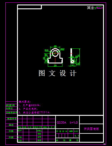 本次设计的零件是开关固定板,通过对零件的形状和尺寸,生产量需求分析,确定该零件设计成级进模,通过对零件的合理排样,然后设计模具结构图,以及非标零件图。