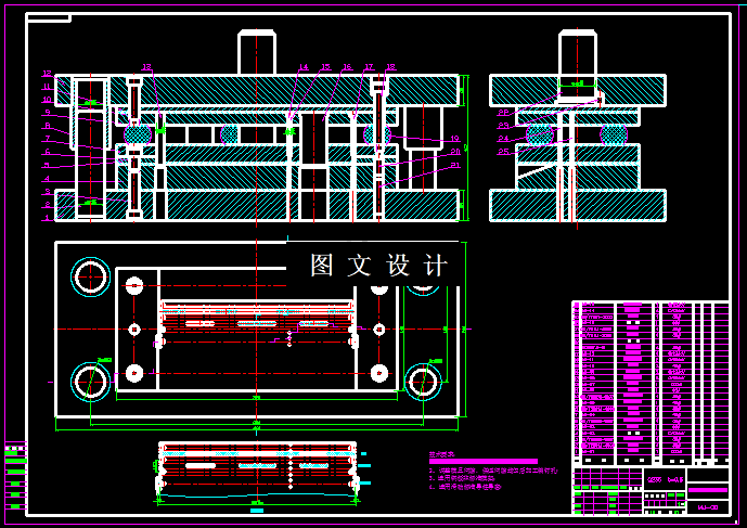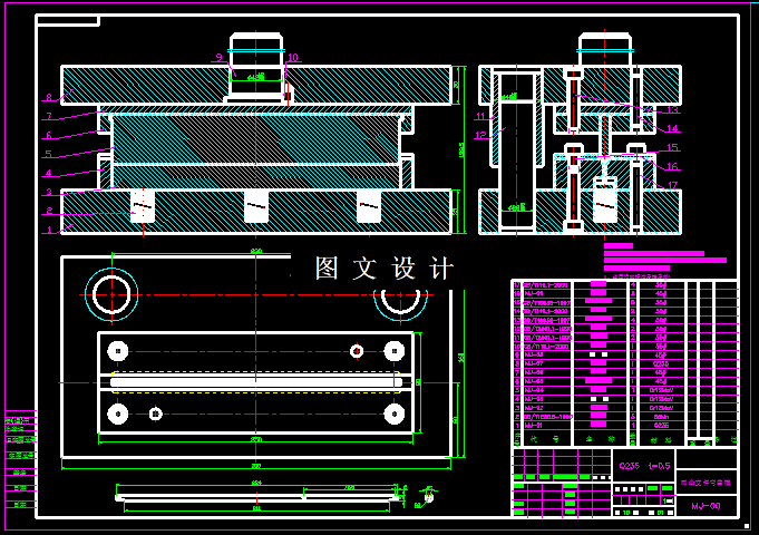 本次设计的零件,是雨伞上的一个支杆,因此该零件比较小,但是比较长,从侧面视图看,是一个类似U形的弯曲件,侧面有孔,但是孔边距离比较小,因此在展开尺寸计算后,平板通过合理排样,选择冲孔落料级进模设计,然后单独设计一套弯曲模,即可实现,具体见设计过程和CAD图纸。