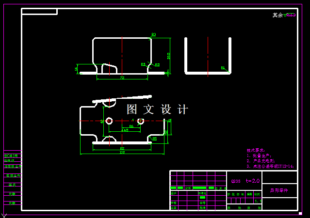 本次设计的零件,形状不规则,侧面有孔,有缺口,通过对直边和斜边的弯曲展开计算后,该展开图形更为复杂,通过详细计算后,设计出该零件的落料冲孔模和弯曲模,绘制模具装配图和零件图。