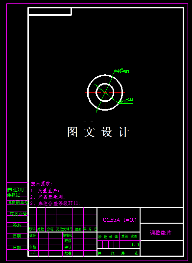 本次设计的调整垫片,通过对零件形状分析,孔的尺寸以及孔边到边的距离,确定可以选择复合模冲压该零件,通过计算和分析,设计合理的排样方案,计算模具刃口尺寸和模具尺寸,设计模具零件图。
