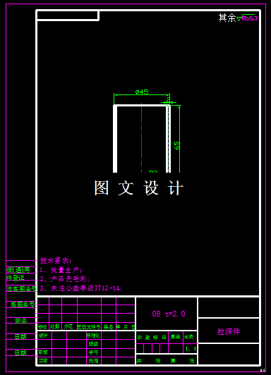 本次设计的拉深件,其形状规则,为筒形件,拉深直径小于拉深件的高度值,因此,此零件必然需要多次拉深,具体通过详细计算得到工序图,本次设计只需要设计其中的首次拉深工序。