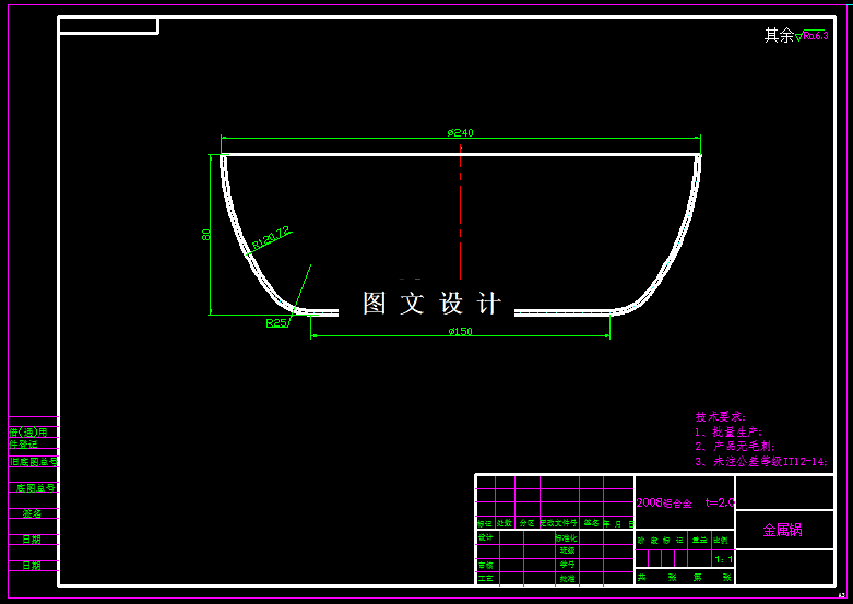 本次设计的是铝材料的碗形零件,材料厚度为2.0mm,通过计算展开尺寸后得知,该零件展开后为圆形,因此,落料和拉深两个工序可以分开设计,本次设计只针对落料工序进行计算和设计结构。