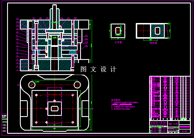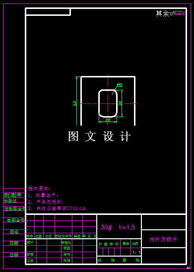 此制件的形状较简单,外形为正方形,四周为直角,中间有一个长方形孔,孔的四周有圆弧过渡,因此只需要考虑工件外形增加过渡R角,增加模具的寿命,采用复合工序模具结构设计。