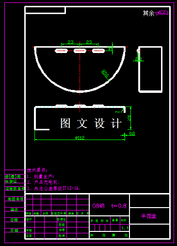 本次设计的零件,从形状分析为半圆形零件,设计冲压工艺时,考虑需要采用这个圆形的工件,作为中间工序,冲压完整体后,再从中间切开,成为两个零件,这样既能保证工件尺寸,又能提高生产效率,保证模具寿命。本次设计只需要设计其中的首次工序,落料拉深模。