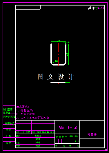 本次设计的课题,形状简单,为U形,但是两侧弯曲的高度尺寸比较大,所以需要考虑工件的回弹,设计过程中,上模和下模的卸料方式,尤为重要,具体设计方案见CAD图纸,本次设计只是设计了其中的弯曲模。