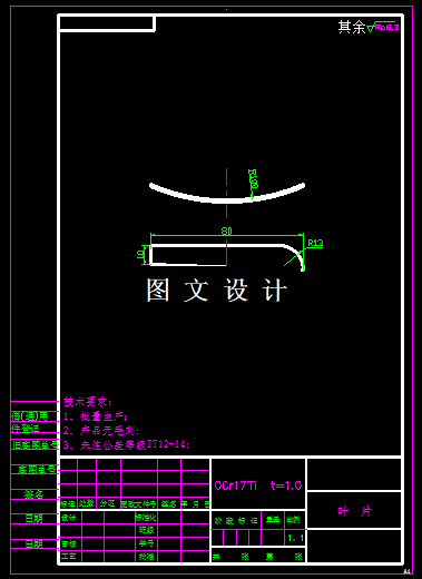该工件的加工涉及到落料、弯曲等多个基本工序内容,从产品外形尺寸分析,该产品尺寸很小,形状规则,都是直线、圆弧过渡,为方便设计模具,落料时直角尖角处建议增加圆角过渡,本次设计只是设计其中的弯曲模。