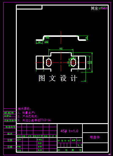 本次设计的弯曲件厚度为1.0mm,因为成型弯曲件需要经过落料、冲孔、弯曲,才能最后实现产品型,由于产品形状简单,弯曲高度也小,因此可以直接按中性层计算出工件展开长度,按此尺寸设计模具。
