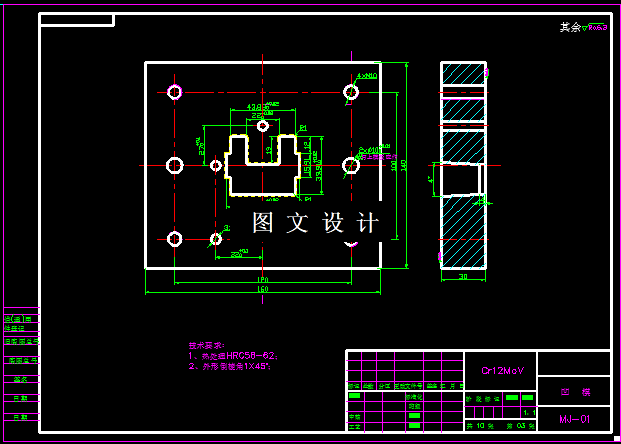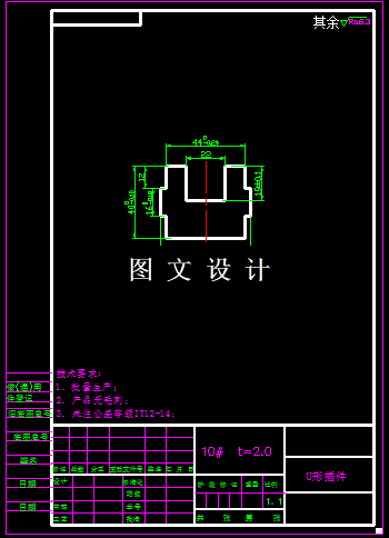 该零件结构简单,左右对称。零件外形轮廓有多处尖角,对模具的制造和使用寿命不利,所以,工件尖角处要适当增加过渡R角,这样才能保证模具寿命,设计单工序落料模。