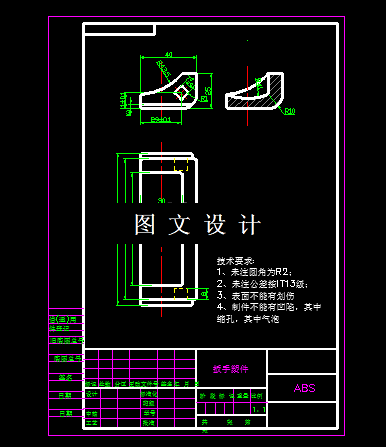 本次设计的零件为塑料扳手,零件壁厚尺寸比较大,平均达到10mm,拐弯处采用圆角半径为3mm的圆弧过渡,侧面有两个圆孔,因此有两面需要设计侧向抽心机构,才能实现自动脱模,提高生产效率,具体见CAD图。