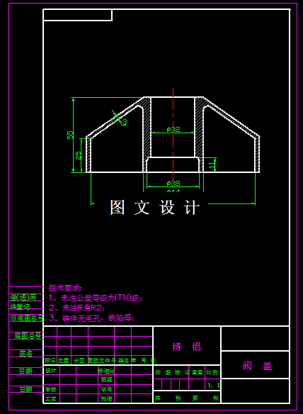 所用零件为铝合金阀盖,材料ZL104,该材料密度为2.65g/mm3,工件体积粗略计算为105.75mm,铸造精度CT5,铸件中间有孔,另一边是个环形平面,中间孔有个台阶,铸件平均壁厚3mm,因此结合工件形状,选择一模两件,具体见CAD图纸。