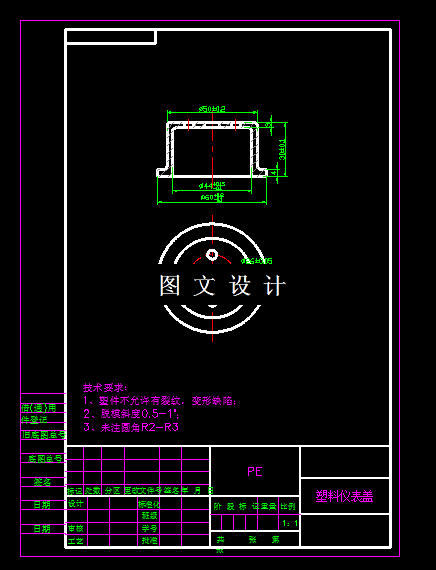 本设计中产品为仪表盖,该产品是一种形状简单的的薄型制品,工件材料采用PE,即聚乙烯(低压),本塑件采用一模四腔的结构,设置4个顶杆推出顶板,从而推出塑件,这样的结构能保证工件的稳定性。