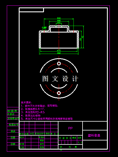 该零件是塑料套盖,体积不大,形状为圆套形,整体结构比较简单,不需要侧向抽芯机构,成形部分采用镶拼式型芯,这样既方便加工,又方便装配。型腔部分采用一模四穴,为了不影响产品的外观,此处采用侧点交口,分型面选择在截面积最大的地方,具体结构见CAD图纸。