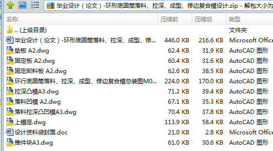 编写说明书时,力求符合设计步骤,详细说明了冲压模具设计的方法及步骤,以及各种参数的具体计算方法,如毛坯直径的计算,主要零件工作部分尺寸的计算,冲压力的计算,模具结构的设计等。