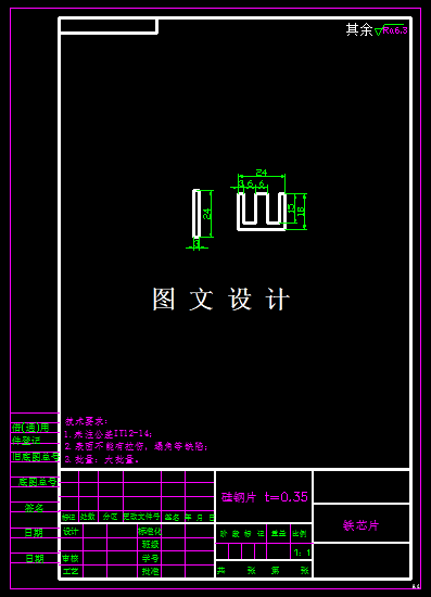 本次设计的铁芯片,形状规则,工件四周无R角,结合图形,综合排样,得到一个最合理的方法,那就是无废料排样法,将产品两边错开,产品长度尺寸为24mm,如果没有废料,那错拍排样后两侧的尺寸就刚好是24mm×3mm。此时工件的材料利用率为100%。