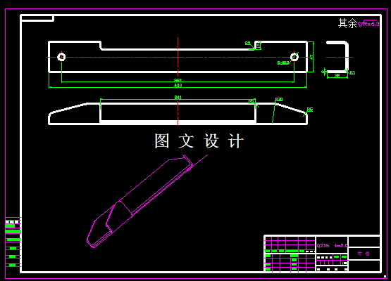 本次设计的汽车前板,形状规则,属于U形零件,两侧弯曲高度尺寸一致,中间有个缺口,基本工序为落料,冲孔,弯曲等,要求设计的是级进模,所以只能考虑中间平板部分作为设计载体,两侧废料切除后弯曲,最后切断载体,工件与模具分离,具体见CAD图纸。