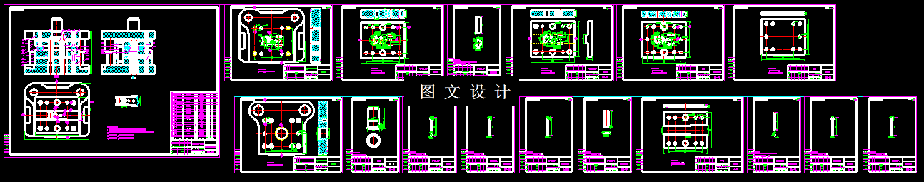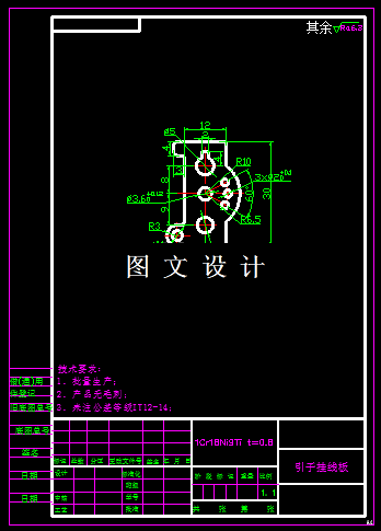 本设计,针对引子挂线板,进行冲孔落料级进模设计,工件材料为1Cr18Ni9Ti,厚度为0.8mm,故采用弹性卸料装置,弹性卸料装置除了卸料的作用外,在冲孔时还起到压紧工件的作用,上模弹性力由橡皮产生,冲孔和外形落料分两个工步冲压实现,工序之间没有干涉,具体见图。
