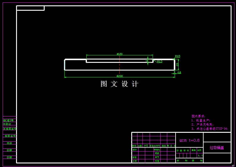 本次设计的垃圾桶盖零件,基本工序有落料,然后拉深,冲孔,翻孔,外形为典型的直筒形拉深件,拉深后的切边余量通过侧滑切边或者机加工,保证零件高度,本次设计需要设计级进模,就需要将工件改制成带凸缘的形状,然后把凸缘齐边切除,如此,切边整齐,模具加工简单,产品高度保持稳定。