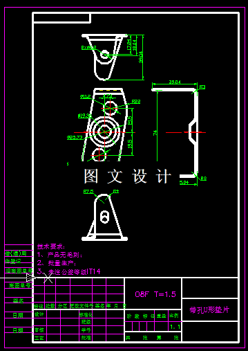 由图而知该图的零件外形尺寸不大且外形简单,要求的精度也不高。整体形状看,是U形弯曲件,弯曲方向一致,零件侧面有2个3.3mm的圆孔,孔的直径和位置要求比较高,将工件工序分解后发现,工序比较多,如果设计单模或者复合模,模具数量多,周转麻烦,误差积累导致工件的精度不稳定,因此设计成级进模最合理。