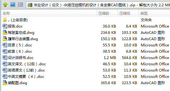 本次毕业设计课题是液压挖掘机。课题是受企业委托而立项。本人致力于液压挖掘机整机设计,即整机参数的计算,整机稳定性计算,整机重心计算,底盘的设计以及履带行走装置的设计。设计思路是从挖掘机总体以及各部分的工作性能和动作要求入手,并以国内的质量和技术性能接近设计要求的挖掘机为基础,研究国外的先进机型,开发出自己的整套液压挖掘机。图纸采用AutoCAD 绘制,经过认真地设计计算,查找资料撰写设计论文。