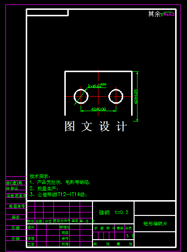 产品外形是矩形,中间有两个大的圆孔,整个产品结构简单,工艺思路一目了然,所选材料为硅钢片,抗剪强度τ=190MPa、抗拉强度σb=3230MPa、伸长率26%。工件基本工序有落料,冲孔,既适合复合模,也适合级进模,相比较他们的优缺点,级进模更能适合批量生产,因此本次设计选择级进模方案。