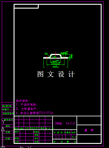 本次设计的盖帽,零件拉深高度为8mm,属于浅拉深,因此可以采用冲压级进模实现,计算工序过程尺寸,需要将工件尺寸反过来推算,根据产品的形状及尺寸,属于带凸缘拉伸件,在设计模具时需要增加其修边余量,最后一道切边将修边余量切掉,所以最后一道工序是切边,通过计算拉深系数,计算出各个工序的尺寸,绘制排样图,设计模具结构图。
