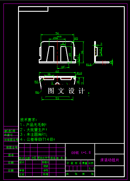 本次设计结合工件形状分析,要求的精度也不高。有一边有两处弯曲,且对称弯曲,属于U形弯曲,下面是V形弯曲,这两个地方弯曲的方向不同,所以在一道工序里难实现,最好是采用多道工序级进模,侧面有3个5.7mm的圆孔,另一边还有2个异形孔,所有孔不在产品同一平面,结合工件形状,原则合适的排样设计,模具结构。