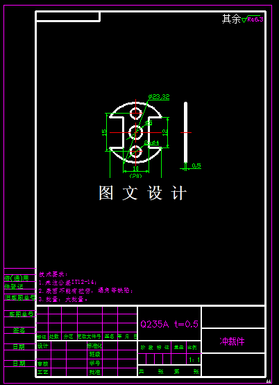 由制件零件图可以知道:制件的外形不规则,中间有两个缺口,四周无R角,所以可以采用落料冲孔的方法尖角无法实现,所以需要考虑方案结合,才能冲出尖角,在设计模具时可以将两个缺口合并成一个方孔,最后再落料,分开后需要多次冲裁才能完成加工,具体方案见CAD排样图及模具图。
