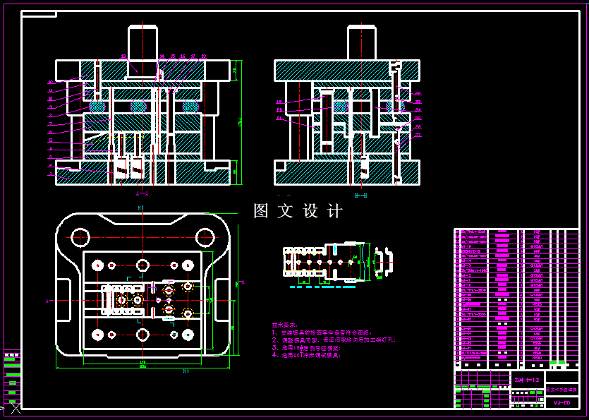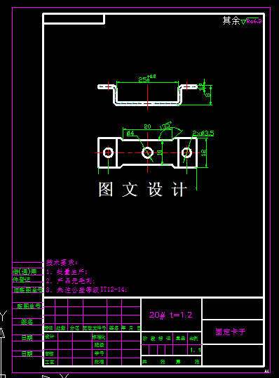 本次设计的固定卡子,为典型的四角弯曲零件,尺寸没标公差,属于自由公差,弯曲r角为0.5,材料厚度t=1.2mm,所以r<0.5t,所以选择小r角的计算公式,通过详细计算后,确定展开图形,根据工序前后顺序,选择合适的排样方案,设计模具结构。