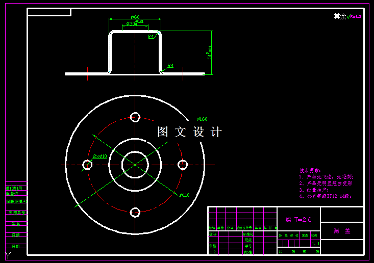 结合产品形状,课题底面有孔,凸缘边也有孔,但是拉伸高度是51mm,底孔和凸缘孔不在同一平面,且落差有51mm之大,所以此两部分孔要分开冲裁,凸缘边4个小孔可以与凸缘切边做同一副模具,同一平面上可以做成复合模。因此本次课题分为5套模具设计完成,同时设计冲孔模具立体图。