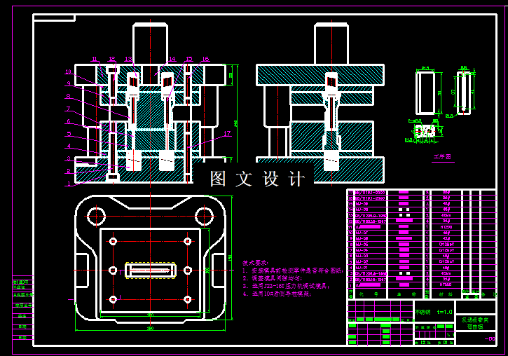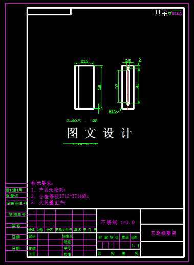 本次设计图形,经过测量和计算,孔边到孔边的最小距离是1.25mm,而材料厚度为1.0mm,1.25mm接近1.0mm,所以不符合复合模设计原理,因此这小孔需要单独冲压,经过以上分析,选择四副模具,虽然工序多,周转困难,但符合设计要求和原理,能保证工件的质量和模具的寿命。