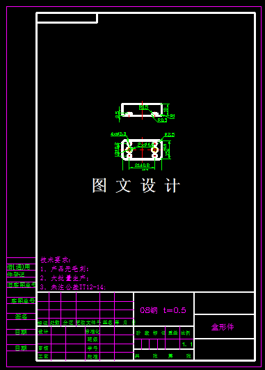 本次设计的盒形件,拉深高度为10mm,且四周有R角过渡,形状较简单,外形为矩形,便于模具的加工,底面还有孔,为了拉伸后的产品高度一致,端面平整,所以产品拉深好之后需要采用后续切边,冲孔等工序完成最后的成品,所选材料为08钢,属于优质碳素结构钢,具体见CAD图纸。