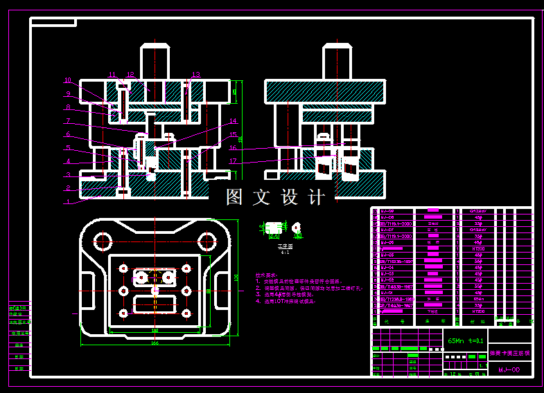 本次设计的弹簧卡圈形状看似,但是尺寸小,模具设计困难,而且还要采用多次冲压,适用小批量生产,零件材料65Mn,属于优质碳素钢,厚度t=0.1mm,传统工艺需要4副模具,有落料、U形弯曲,D形弯曲和压凸包,本次设计在原有的基础上,将U型弯曲,D型弯曲2次成型合并在一副模具内完成,避免二次定位,具体见CAD图纸。