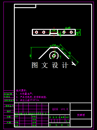 此制件为支撑板,其形状较简单,为三边弯曲的零件,且对称,四角无圆角过渡,为方便模具的加工,减少冲压时在尖角处开裂的现象,所以展开后尖角处需要增加过渡R角,根据产品材料厚度1mm,选择过渡R角为R0.5,所选材料为Q235,此材料为普通质结构钢,设计结构图具体见CAD图。