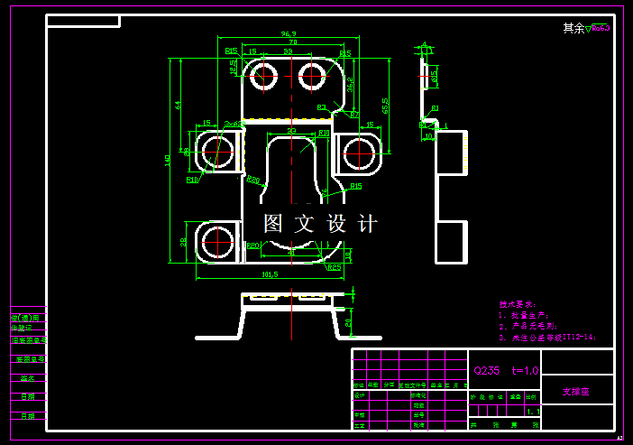 此制件的形状一眼看上去很复杂,工序多,有落料,冲孔,Z形弯曲,翻孔等,弯曲主要就是成Z形,产品展开后形状怪异,工件材料厚度为1.0mm,对整个冲压件,产品外观要求比较高,尤其是弯曲的台阶高度20mm,10mm,有公差要求,工序多,所以本次设计只设计其中的落料冲孔模,冲孔翻孔模,两套模具。