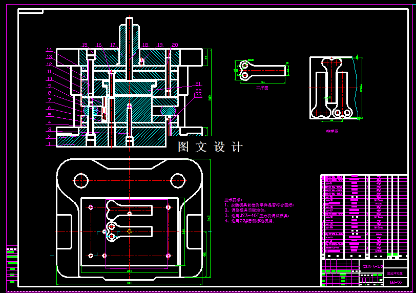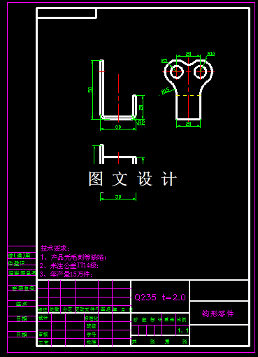 本次设计的零件属于U形零件,外形不规则,工件材料为Q235,厚度为2.0mm,基本工序有落料,冲孔,弯曲,通过计算展开尺寸后,绘制出展开图形,此时外形呈T形,所以可以考虑采用错位排样法,大头和小头错开排,这样能够充分利用材料,落料和冲孔可以合并成一副模具,两幅模具实现。