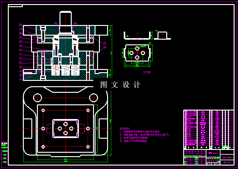 此支架成U型,所以其形状较简单,而且对称,四角圆角过渡,方便模具的加工,所以可以按U形弯曲件计算展开尺寸,本次课题弯曲r角为3.0mm,远超过0.5t=0.5×2=1.0mm,所以该零件属于大R角弯曲,直接按中性层不变原则计算展开尺寸,通过详细计算得到模具各个尺寸,绘制落料冲孔模,弯曲模。