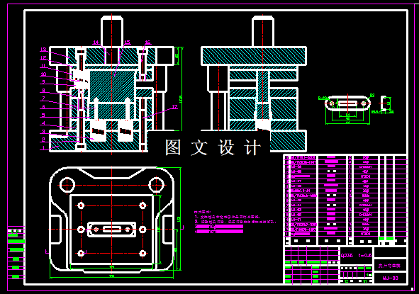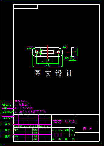 本次设计的夹片,形状简单,而且规则,因此工艺一眼就能看出,采用落料冲孔复合模,弯曲模,通过对展开尺寸,工序冲压力计算,压力中心及压力机选择,刃口尺寸计算,模具外形计算等,绘制出合理的模具结构,3D立体图,编制设计说明书。