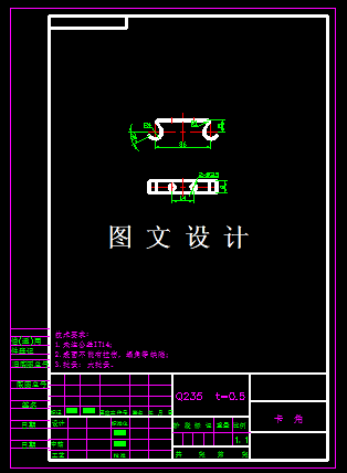 本次设计的卡角,材料为Q235,厚度为0.5mm,因为成型弯曲件需要经过落料、冲孔、弯曲,工序比较多,所以落料和冲孔采用复合模,弯曲采用滑块结构,单独一次成型,具体见CAD图纸。
